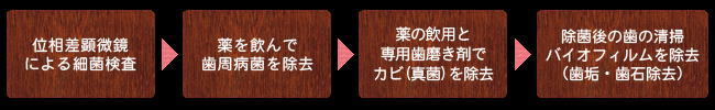 そこで、自信を持って患者様にお勧めしたい治療が、位相差顕微鏡とお薬を使って治す「歯周内科治療」です。お口の中の細菌を顕微鏡で観察して、歯周病の原因菌を特定し、薬により細菌を退治(除菌)します。